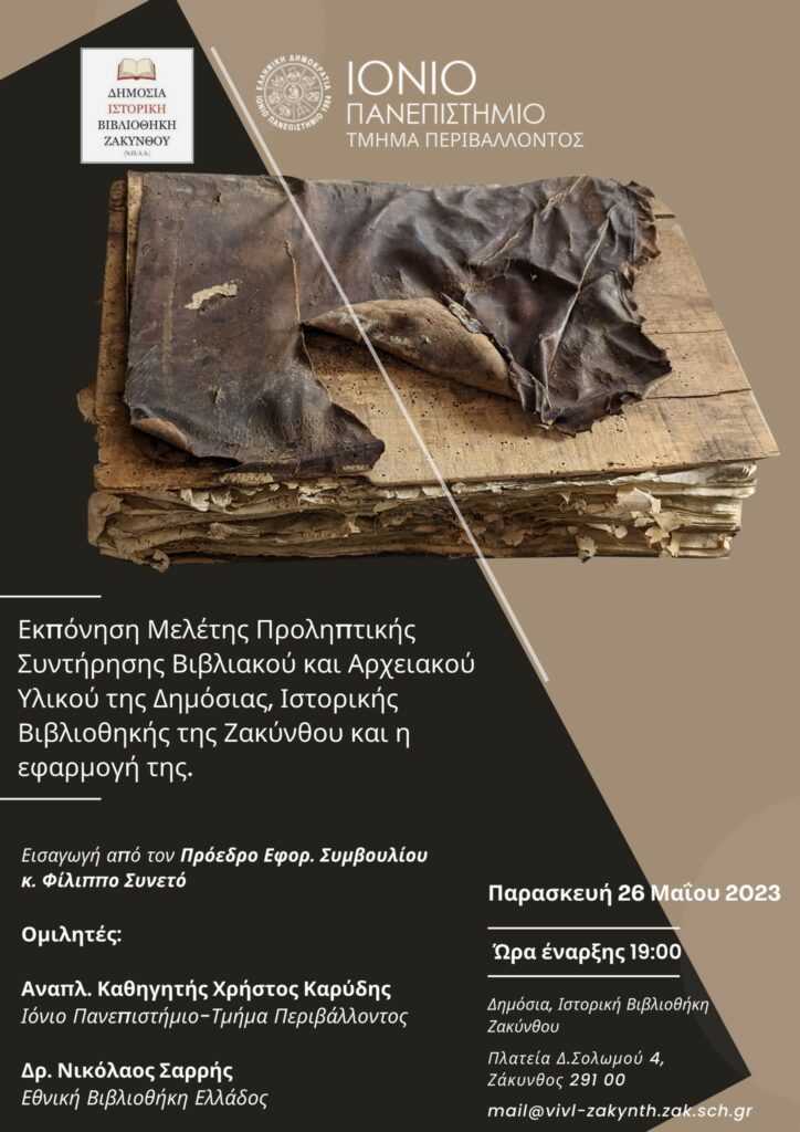 Εκπόνηση Μελέτης Προληπτικής Συντήρησης Βιβλιακού και Αρχειακού Υλικού της Δημόσιας, Ιστορικής Βιβλιοθήκης της Ζακύνθου και η εφαρμογή της.
